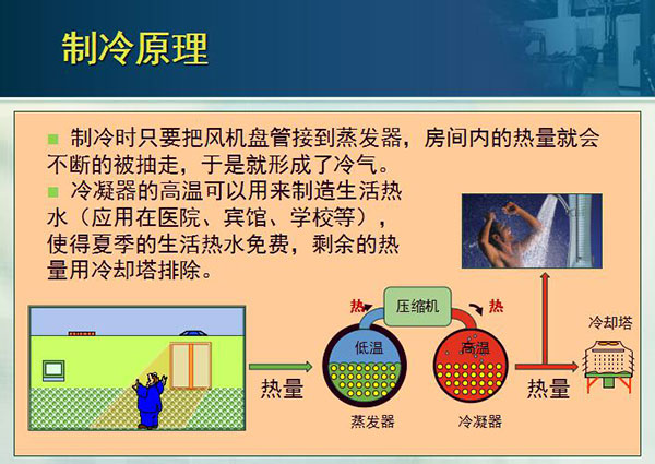 2.夏季制生活熱水幾乎免費:夏季采用熱回收的原理,將室內熱量排出的同時,利用室內熱量制作生活熱水,因此生活熱水幾乎免費。