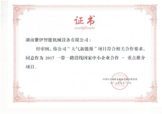 2017年9月21日——湖南紫伊智能機械設備有限公司主導的“大氣新能源”項目經審核,正式被列為“2017一帶一路沿線國家中小企業合作?重點推介項目”!并被授予含金量極高的《證書》!為紫伊智能開辟“一帶一路”創新節能環保事業增加了更強勁的助推力!